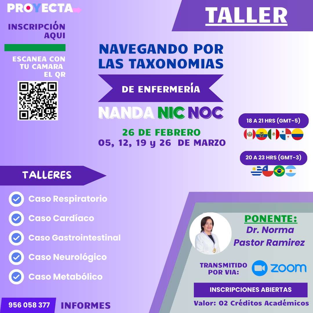 Todos los participantes que concluyan satisfactoriamente el Taller «Navegando por las Taxonomías de Enfermería: Un Viaje Práctico con NANDA, NIC y NOC, cumpliendo con una asistencia mínima del 70% y obteniendo una calificación final igual o superior a 14, serán acreedores de un certificado oficial. Este documento certificará la obtención de 02 créditos académicos