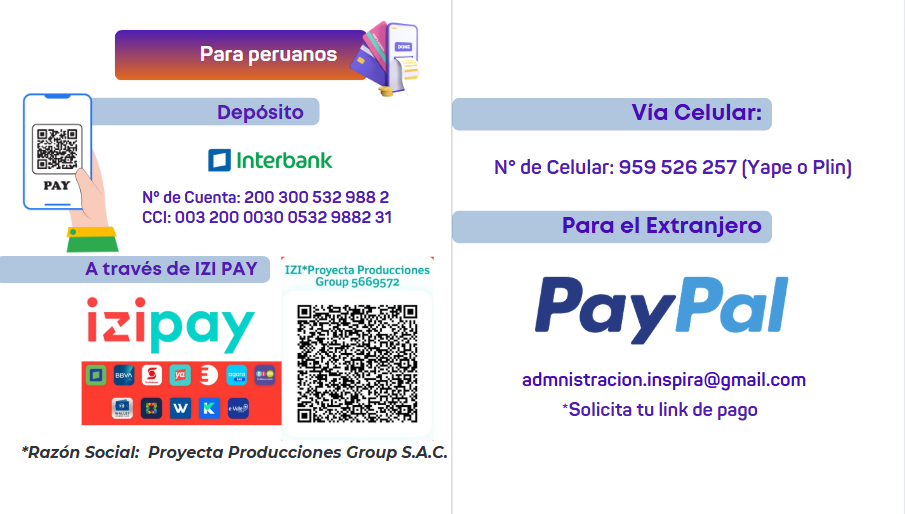 Realizar el pago correspondiente el método que mas se le facilite, contamos con transferencia bancaria e interbancaria, Izi Pay, Yape o Plin. Y para los extranjeros, contamos con PayPal, no se olviden de completar los datos que se les pide.